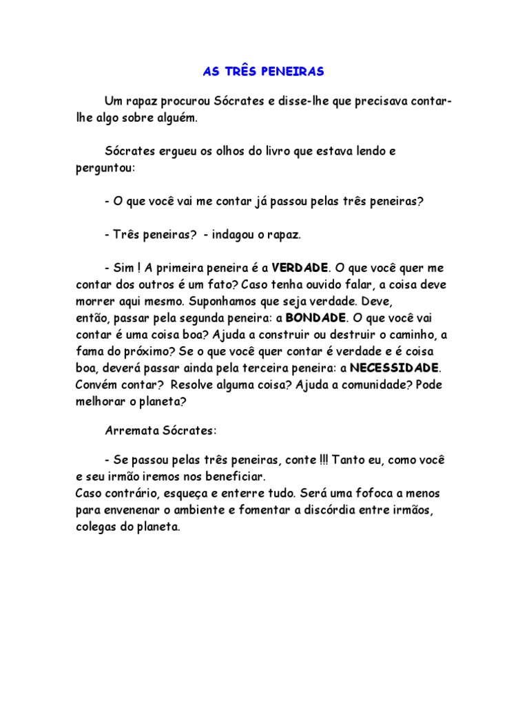 As Três Peneiras https://www.scribd.com/document/66886048/AS-TRES-PENEIRAS