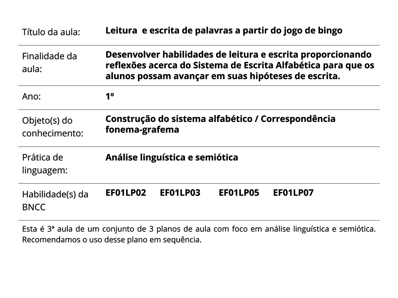 Plano De Aula 1º Ano Língua Portuguesa Leitura E Escrita De https://novaescola.org.br/plano-de-aula/3007/leitura-e-escrita-de-palavras-a-partir-do-jogo-de-bingo